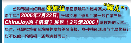 MM在那接待届时光临的玩家,此外还将有18位“娜儿”分散在会场的各处向玩家散发宣传单。所有的“娜儿”都期待着与您进行交流和合影。处处有娜儿,处处有洛奇。2005年7月21日至23日,在ChinaJoy的2号馆2006《洛奇》展区,张娜拉和“娜儿”期待您的光临! |